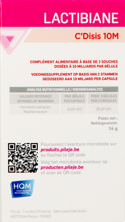 Voedingssupplement op basis van probiotica ter bevordering van de darmflora voor meer intiem comfort. Lactibiane C'disis bestaat uit 10 miljard Lactobacillus helveticus LA401 per capsule. Lactibiane is gegarandeerd lactose- en glutenvrij.