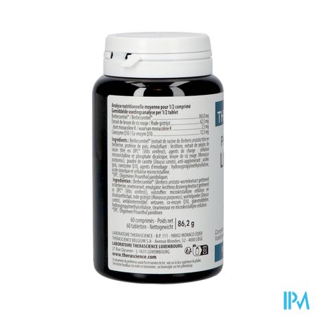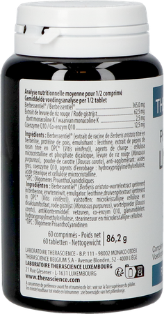Berbessentiel® (Berberis aristata-wortelextract getitreerd in berberine, erwteneiwit, emulgator: lecithine,druivenpitextract getitreerd in OPC* (Vitis vinifera)), vulstoffen: microkristallijne cellulose en dicalciumfosfaat, rode gistrijst (Monascus purpureus), wortelpoeder (Daucus carota), antiklontermiddel: vetzuren, co-enzym Q10, glansmiddelen: hydroxypropylmethylcellulose, vetzuren en microkristallijne cellulose.