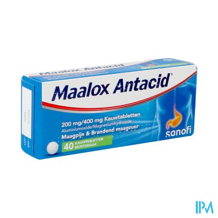Maalox Antacid 200mg/400mg Kauwtabletten: 1 kauwtablet bevat 400 mg gehydrateerd aluminiumoxide (= 200 mg aluminiumoxide) en 400 mg magnesiumhydroxide. Hulpstoffen met bekend effect: 259,2 mg saccharose en 125 mg sorbitol.