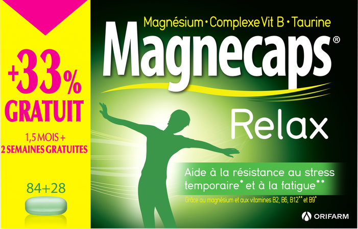 MAGNECAPS® Relax helpt bij de normale psychologische functie, zoals de weerstand tegen tijdelijke stress dankzij vitamine B9(*). MAGNECAPS® Relax draagt bij tot vermindering van vermoeidheid dankzij magnesium en vitamines B2, B6 en B12 (**).