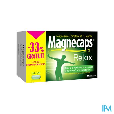 Magnecaps Relax Tabl 84 + 28 Grat. is een voedingssupplement, verkrijgbaar in uw buurtapotheek of online apotheek. Neem niet meer dan de aanbevolen dagelijkse dosis vermeld op de verpakking. Het vervangt geen gezonde levensstijl en gevarieerde en evenwichtige voeding. Vraag raad aan uw apotheker. Het product altijd buiten het bereik van kinderen houden.