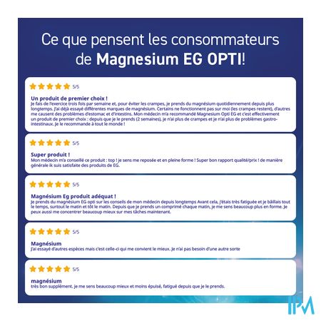 Magnesium bestaat in verschillende vormen waartussen grote verschillen in biologische beschikbaarheid en gastro-intestinale tolerantie kunnen bestaan. Magnesium Opti EG bevat magnesium onder de vorm van citraat, tauraat en glycerofosfaat, specifieke vormen van magnesium die goed verdragen worden in het maagdarmkanaal en een goede biologische beschikbaarheid (= een hoge opname door ons organisme) hebben.**