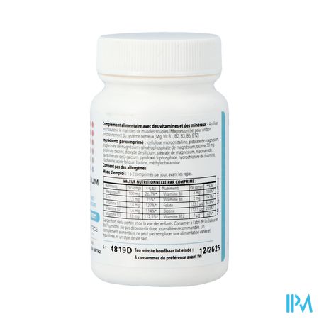 Samenstelling per tablet: Magnesiumpidolaat 396 mg, Magnesiumbisglycinaat 340 mg, Magnesiumglycerofosfaat 310 mg, L Taurine 50 mg, Zinkpicolinaat 38 mg, B3 (Niacinamide) 19.2 mg, B9 (Folaat) 17.4 mg, B5 (Calciumpantothenaat) 7.5 mg, B8 (Biotine) 6.4 mg, B6 (Pyridoxaalfosfaat) 3.1 mg, B2 (Riboflavine) 2.4 mg, B1 (Thiaminemononitraat) 2.1 mg, B12 (Methylcobalamine) 0.001 mg.