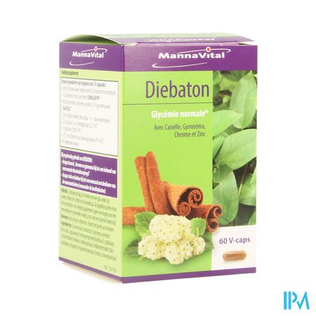 Mannavital Diebaton V-caps 60 is een voedingssupplement, verkrijgbaar in uw buurtapotheek of online apotheek. Neem niet meer dan de aanbevolen dagelijkse dosis vermeld op de verpakking. Het vervangt geen gezonde levensstijl en gevarieerde en evenwichtige voeding. Vraag raad aan uw apotheker. Het product altijd buiten het bereik van kinderen houden.