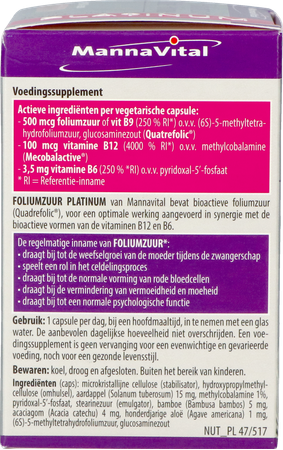 Voor een normaal verloop van de intensieve celdelingen en de daaraan verbonden weefselgroei die tijdens de zwangerschap plaatsgrijpt, is het B-vitamine foliumzuur onmisbaar. De bioactieve vorm van foliumzuur, die zeer goed wordt opgenomen, is 5-methyltetrahydrofoliumzuur. Dat is dan ook de hoofdingrediënt van FOLIUMZUUR PLATINUM van Mannavital. Omdat foliumzuur op veel vlakken in synergie samenwerkt met de vitamines B6 en B12, zijn ook deze vitaminen – alweer in hun correcte, bioactieve vormen – eveneens opgenomen in de formule van FOLIUMZUUR PLATINUM. Dat komt ook de aanmaak van rode bloedcellen, het energiepeil, een normale werking van het zenuwstelsel en een normale homocysteïnespiegel ten goede, ook voor niet-zwangere vrouwen en voor mannen.
