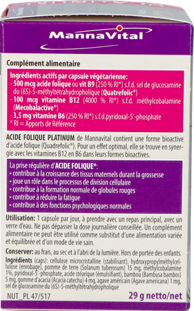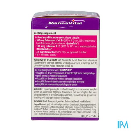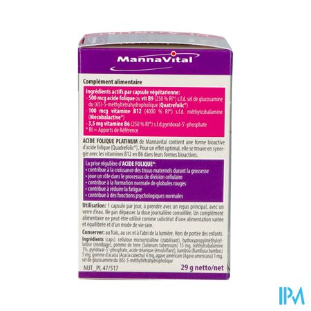 Mannavital Foliumzuur Platinum V-caps 90 is een voedingssupplement, verkrijgbaar in uw buurtapotheek of online apotheek. Neem niet meer dan de aanbevolen dagelijkse dosis vermeld op de verpakking. Het vervangt geen gezonde levensstijl en gevarieerde en evenwichtige voeding. Vraag raad aan uw apotheker. Het product altijd buiten het bereik van kinderen houden.