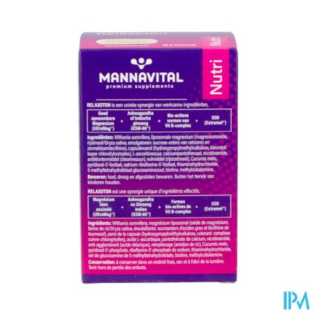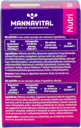 Mannavital Relaxoton Comp 60 is een voedingssupplement, verkrijgbaar in uw buurtapotheek of online apotheek. Neem niet meer dan de aanbevolen dagelijkse dosis vermeld op de verpakking. Het vervangt geen gezonde levensstijl en gevarieerde en evenwichtige voeding. Vraag raad aan uw apotheker. Het product altijd buiten het bereik van kinderen houden.