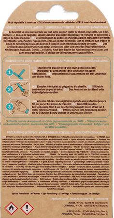 Elke armbanddoos bevat een dosis muggenwerende oplossing (voor 1 maand herhaald gebruik). Wees voorzichtig met biociden. Lees voor gebruik het etiket en de productinformatie.
