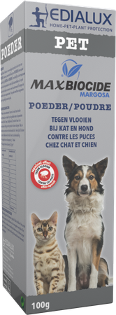 Max Biocide poeder is een ecologisch product met een repulsief effect tegen vlooien bij katten en honden. Onmiddellijk na het toepassen op de huid verspreiden de natuurlijke bestanddelen zich op de pels van het dier en vormen zo een beschermende film tegen de aanvallen van ectoparasieten. Het poeder heeft een aangename geur en geeft glans aan de pels. Niet gebruiken op zieke en herstellende dieren en op pups of kittens jonger dan 10 weken.
