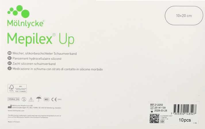 Mepilex Up is een uiterst vormbaar verband dat laag- en hoog-viskeuze exsudaten absorbeert, de wond vochtig houdt en het risico op verweking minimaliseert. De zachte siliconenlaag (Safetac®) kleeft niet aan de vochtige wond, maar op een zachte manier aan de droge huid rondom de wond. Het beschermt de wond en huid, en minimaliseert pijn bij patiënten en trauma van wonden en de omliggende huid bij verwijdering van het verband.