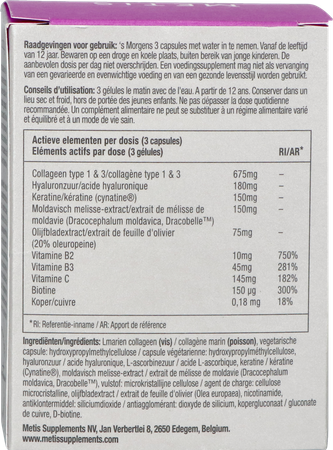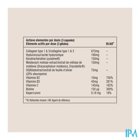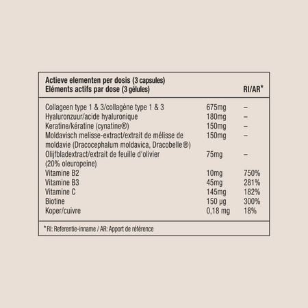 Marien collageen (vis), hyaluronzuur, L-ascorbinezuur, keratine (Cynatine®), moldavische melisse extract (Dracocephalum moldavica, Dracobelle™), vegetarische capsule: hydroxypropylmethylcellulose, vulstof: microkristallijne cellulose, olijfbladextract (Olea europaea), nicotinamide, riboflavine, antiklontermiddel: siliciumdioxide, kopergluconaat, D-biotine