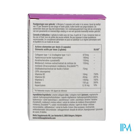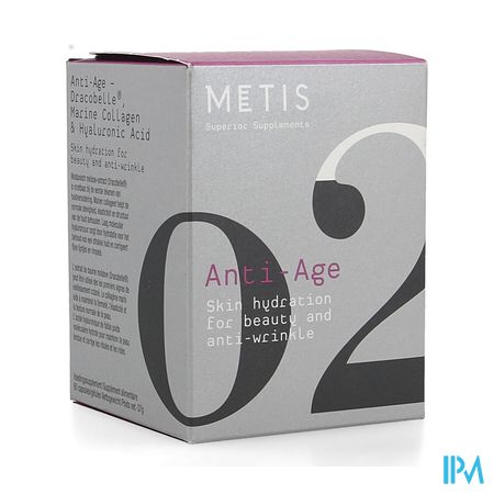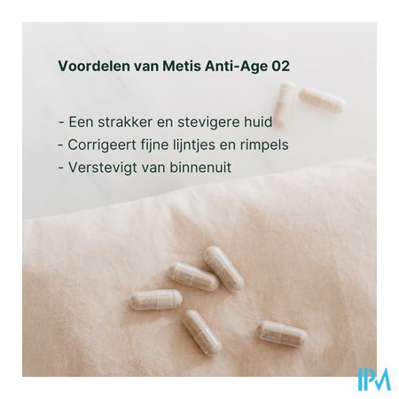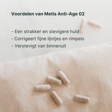 Metis Anti-Age 02 is een effectief supplement dat je lichaam helpt beschermen tegen rimpels, fijne lijntjes en ouderdomsvlekken. Het hydrateert en verstevigt je huid van binnenuit en is een uitstekende aanvulling aan je skincare routine die bijdraagt tot een strakke en stevige huid.