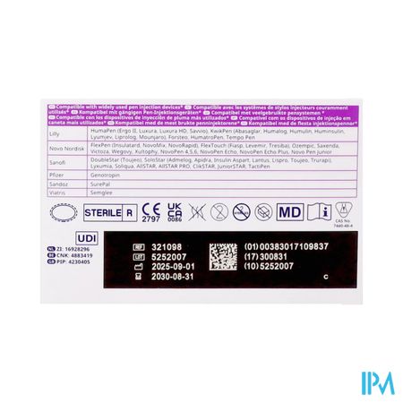 - Het wordt aanbevolen om pennaalden slechts één keer te gebruiken. Pennaalden zijn voor eenmalig gebruik. Daarna zijn ze niet meer steriel.