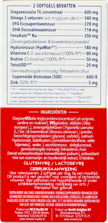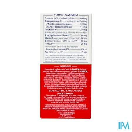 DiepzeeVISolie-triglyceridenconcentraat (uit ansjovis, sardine en makreel), VISgelatine, olijfolie (Olea europea L.), zevengetijdeklaver (Trigonella caerulea (L.) Ser.) & boerenkool (Brassica oleracea L.) poeder, bevochtigingsmiddelen (glycerol, sorbitol), stabilisators (zonnebloemlecithine, witte bijenwas), natrium hyaluronaat, L-ascorbinezuur, water, zinkgluconaat, gevriesdroogde microalg Tetraselmis chuii (bevat verwaarloosbare hoeveelheden jodium), antioxidant: mix van rozemarijn- en tocoferolrijk extract, D-biotine.