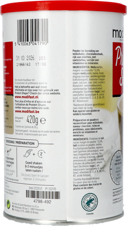 Modifast Protein Shape Chocolate Milkshake 420g is een voedingssupplement, verkrijgbaar in uw buurtapotheek of online apotheek. Neem niet meer dan de aanbevolen dagelijkse dosis vermeld op de verpakking. Het vervangt geen gezonde levensstijl en gevarieerde en evenwichtige voeding. Vraag raad aan uw apotheker. Het product altijd buiten het bereik van kinderen houden.