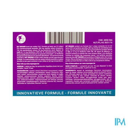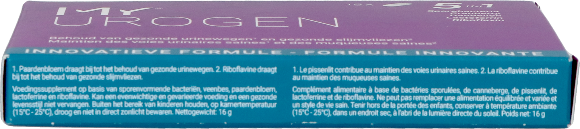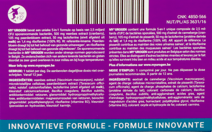 MY®UROGEN bevat per tablet 500 mg veenbes extract (Vaccinium macrocarpon), 105 mg paardenbloem extract (Taraxacum officinale), 2,5 miljard CFU sporenvormende bacteriën (Bacillus coagulans en Bacillus subtilis), 50 mg lactoferrine (eiwit afgeleid uit melk) aangevuld met 1,4 mg vitamine B2 (100% RI). RI: referentie-inname.