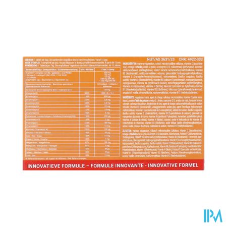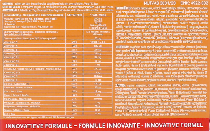 mariene magnesium, vulstof: microkristallijne cellulose, vitamine C (ascorbinezuur), omega-3 visolie poeder, L-lysine, co-enzyme Q10, maïszetmeel, ijzerfumaraat, kleurstof: calciumcarbonaat, zinkbisglycinaat, vulstof: vernette natriumcarboxymethylcellulose, vitamine B3 (nicotinamide), antiklontermiddelen: vetzuren, glansmiddel: hydroxypropylmethylcellulose, vitamine E (D-α-tocoferylwaterstofsuccinaat), natriumseleniet, Bacillus coagulans, Bacillus subtilis, vitamine D (cholecalciferol), vitamine B5 (calcium-D-pantothenaat), mangaangluconaat, kopergluconaat, vitamine B6 (pyridoxaal-5'-fosfaat), bevochtigingsmiddel: polyethyleenglycol, vitamine A (retinylacetaat), vitamine H (biotine), kleurstof: ijzeroxiden en -hydroxiden, vitamine B1 (thiaminehydrochloride), vitamine B2 (riboflavine), foliumzuur (pteroylmonoglutaminezuur), smaakstof: vanille, chroomchloride, natriummolybdaat, vitamine B12 (methylcobalamine).