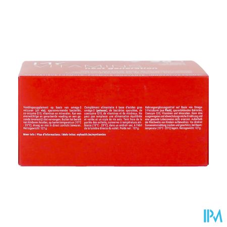 Voedingssupplement op basis van omega-3 vetzuren (uit vis), sporenvormende bacteriën, co-enzyme Q10, vitaminen en mineralen.