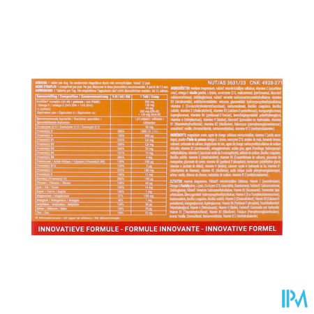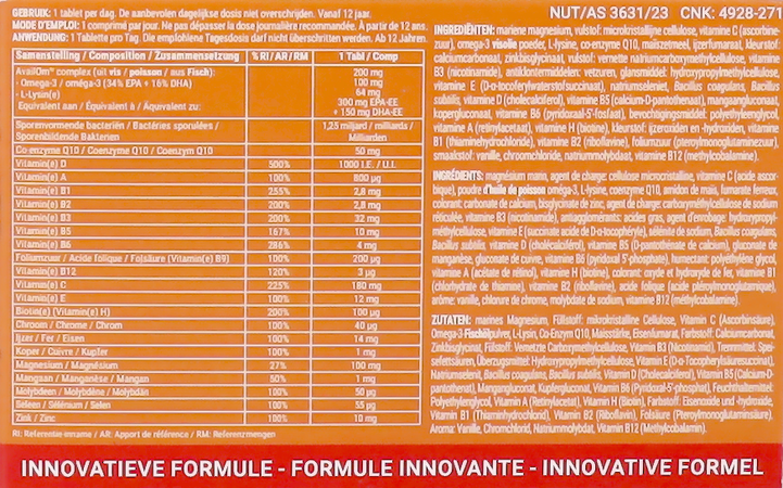 mariene magnesium, vulstof: microkristallijne cellulose, vitamine C (ascorbinezuur), omega-3 visolie poeder, L-lysine, co-enzyme Q10, maïszetmeel, ijzerfumaraat, kleurstof: calciumcarbonaat, zinkbisglycinaat, vulstof: vernette natriumcarboxymethylcellulose, vitamine B3 (nicotinamide), antiklontermiddelen: vetzuren, glansmiddel: hydroxypropylmethylcellulose, vitamine E (D-α-tocoferylwaterstofsuccinaat), natriumseleniet, Bacillus coagulans, Bacillus subtilis, vitamine D (cholecalciferol), vitamine B5 (calcium-D-pantothenaat), mangaangluconaat, kopergluconaat, vitamine B6 (pyridoxaal-5'-fosfaat), bevochtigingsmiddel: polyethyleenglycol, vitamine A (retinylacetaat), vitamine H (biotine), kleurstof: ijzeroxiden en -hydroxiden, vitamine B1 (thiaminehydrochloride), vitamine B2 (riboflavine), foliumzuur (pteroylmonoglutaminezuur), smaakstof: vanille, chroomchloride, natriummolybdaat, vitamine B12 (methylcobalamine).