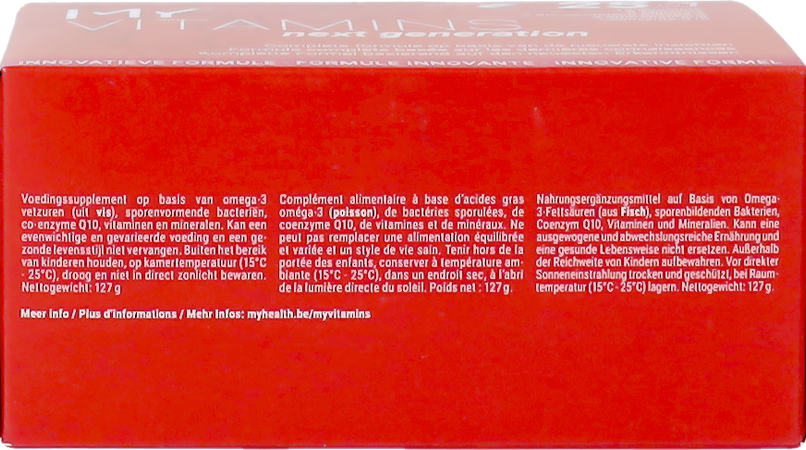 De innovatieve 25-in-1 formule MY®VITAMINS next generation is de meest complete aanvulling voor de dagelijkse behoefte aan nutriënten: 12 vitaminen waaronder een hoge dosis vitamine D, 8 mineralen, 2 omega-3 vetzuren (EPA en DHA) met een hoge biobeschikbaarheid, 2 soorten sporenvormende bacteriën (Bacillus coagulans en Bacillus subtilis) en co-enzyme Q10.