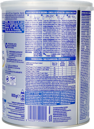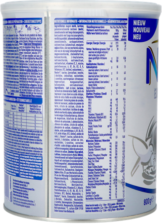 Magere melk, lactose, gedemineraliseerde melkwei (melk), zonnebloemolie met hoog oliezuurgehalte, koolzaadolie met laag erucazuurgehalte, verdikkingsmiddel: johannesbroodpitmeel; zonnebloemolie, aardappelzetmeel, calciumcitraat, kaliumcitraat, emulgator: sojalecithine, olie van mortierella alpina, olie van de microalg Schizochytrium sp, magnesiumchloride, cholinebitartraat, kaliumchloride, L-fenylalanine, natriumchloride, natriumcitraat, natriumfosfaat, vitamines (C, E, niacine, pantotheenzuur, A, B1, B6, B2, D, K, foliumzuur, B12, biotine), maïszetmeel, L. Reuteri*, taurine, ijzersulfaat, inositol, L-histidine, zinksulfaat, nucleotiden, L-carnitine, zuurteregelaar: citroenzuur; kopersulfaat, mangaansulfaat, kaliumjodide, natriumselenaat. *L. culture DSM 17938 Under license from BioGaia AB.