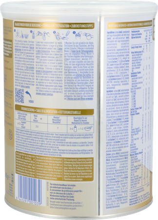 Ingrediënten: lactose (melk), zonnebloemolie met hoog oliezuurgehalte, wei-eiwit isolaat (melk), wei-eiwitconcentraat (melk), koolzaadolie met laag erucazuurgehalte, zonnebloemolie, calciumcitraat, calciumfosfaat, kaliumfosfaat, kaliumchloride, magnesiumchloride, olie van mortirella alpina, olie van de microalg Schizochytrium sp, natriumfosfaat, L-arginine, 3'-fucosyllactose (3'-FL), mengsel van 2'-fucosyllactose (2'-FL)/difucosyllactose (DFL), lacto-N-tetraose (LNT), zuurteregelaar: citroenzuur; L-histidine, vitamines (C, niacine, pantotheenzuur, E, B2, B1, A, B6, foliumzuur, K, biotine, D, B12), L-fenylalanine, 3'- sialyllactosenatriumzout (3'-SL), ijzersulfaat, 6'- sialyllactosenatriumzout (6'-SL), B.infantis LMG11588, zinksulfaat, kopersulfaat, B. lactis, mangaansulfaat, kaliumjodide, natriumselenaat.