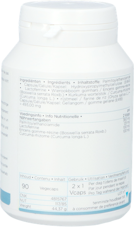 Natineq is een unieke formule op basis van zuivere Lactoferrine, PEA (Palmitoylethanolamide), Boswelia en Curcuma* die bijdraagt tot het verminderen van pijn en ontsteking.