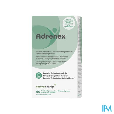Adrenex Caps 60 Natural Energy is een voedingssupplement, verkrijgbaar in uw buurtapotheek of online apotheek. Neem niet meer dan de aanbevolen dagelijkse dosis vermeld op de verpakking. Het vervangt geen gezonde levensstijl en gevarieerde en evenwichtige voeding. Vraag raad aan uw apotheker. Het product altijd buiten het bereik van kinderen houden.