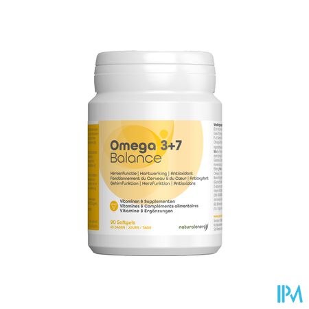 Omega 3+7 Balance Caps 90 Natural Energy is een voedingssupplement, verkrijgbaar in uw buurtapotheek of online apotheek. Neem niet meer dan de aanbevolen dagelijkse dosis vermeld op de verpakking. Het vervangt geen gezonde levensstijl en gevarieerde en evenwichtige voeding. Vraag raad aan uw apotheker. Het product altijd buiten het bereik van kinderen houden.