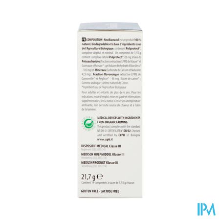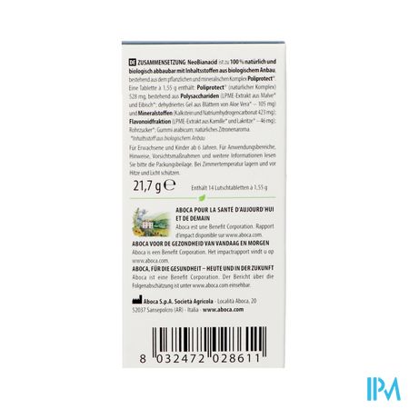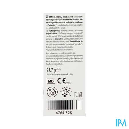 NeoBianacid is een product op basis van Poliprotect ® - een planten- en mineralencomplex - dat de beschermende werking van het slijm dat van nature het slijmvlies bedekt, versterkt. Het heeft een 100% natuurlijke formule, gebaseerd op ingrediënten uit de biologische landbouw.