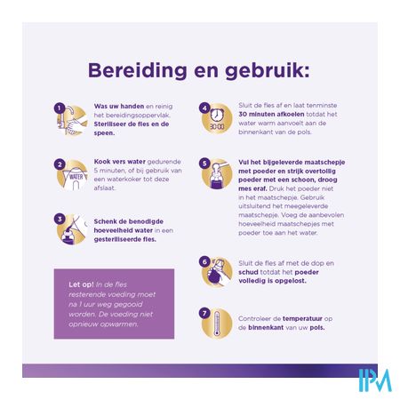 In de fles resterende voeding moet na 1 uur weg gegooid worden. De voeding niet opnieuw opwarmen.