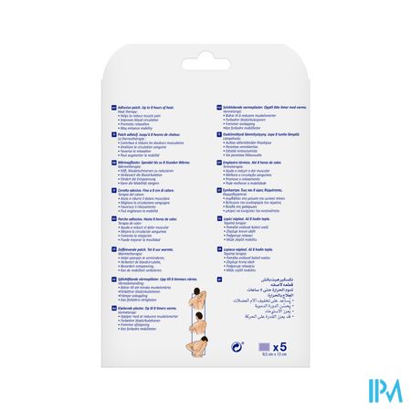 - Elke verpakking bevat 5 pleisters: 9,5 cm x 13 cm