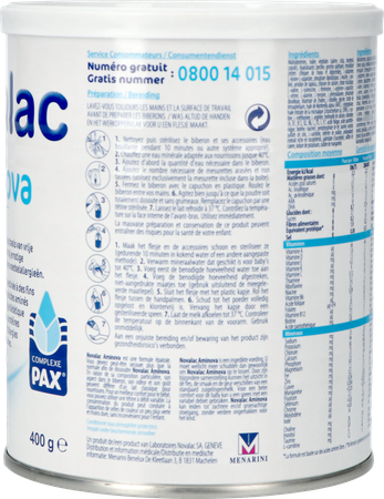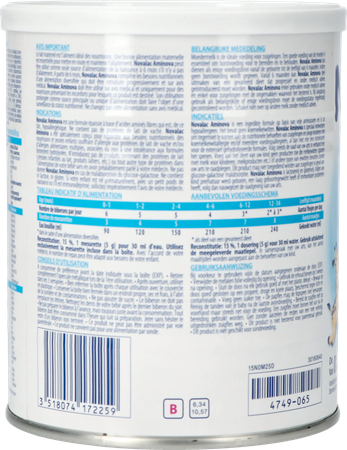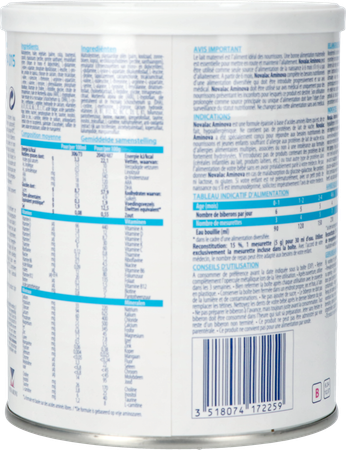 Novalac Aminova is een ingedikte formule op basis van vrije aminozuren en is zo hypoallergeen. Het bevat geen koemelkeiwitten. Novalac Aminova is speciaal ontworpen om tegemoet te komen aan de nutritionele behoeften van zuigelingen en jonge kinderen met koemelkeiwitallergie en/of meerdere voedingsallergieën, al dan niet met een intolerantie voor de extensief gehydrolyseerde formules. Volg steeds de raad van uw arts in verband met het spenen. Voeg aan het dieet van uw kind geen producten toe die melkeiwitten (granen met melk voor kinderen, melkproducten etc.) of andere types van eiwitten bevatten zonder uw arts te raadplegen. Indien uw kind prematuur werd geboren, een laag geboortegewicht heeft of immunitaire problemen heeft, volg dan nauwgezet de raadgeving van uw arts.