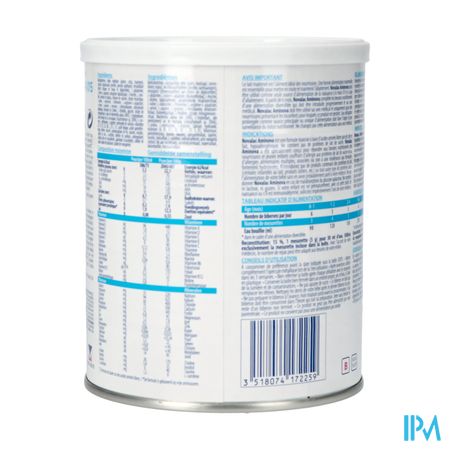 Maltodextrines, plantaardige oliën (palm, koolzaad, zonnebloem, kopra), verdikkingsmiddelen (pectine, xanthaangom), emulgator (citroenzuuresters van mono- en diglyceriden), L-glutamine, L-lysine-L-aspartate, dikaliumfosfaat, L-leucine, L-proline, tapiocazetmeel, calciumchloride, tricalciumcitraat, L-valine, L-isoleucine, L-threonine, L-arginine-L-aspartate, L-serine, L-alanine, L-tyrosine, L-fenylalanine, cholinebitartraat, L-histidine, dinatriumfosfaat, glycine, trimagnesiumcitraat, Mortierella alpina olie (ARA), L-tryptofaan, olie geëxtraheerd uit de microalg Schizochytrium sp. (DHA), L-cystine, L-methionine, L-arginine, calcium hydroxide, vitamines (A, B1, B12, B2, B6, C, D3, E, K1, foliumzuur, pantotheenzuur, biotine, niacine), ijzerpyrofosfaat, inositol, taurine, L-carnitine, zinksulfaat, natriumseleniet, anti-oxidantia (extract rijk aan tocoferolen, ascorbylpalmitaat), kopersulfaat, kaliumjodide, mangaansulfaat.