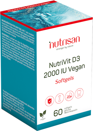 Nutrivit D3 2000 Iu Vegan Softgels 60 is een voedingssupplement, verkrijgbaar in uw buurtapotheek of online apotheek. Neem niet meer dan de aanbevolen dagelijkse dosis vermeld op de verpakking. Het vervangt geen gezonde levensstijl en gevarieerde en evenwichtige voeding. Vraag raad aan uw apotheker. Het product altijd buiten het bereik van kinderen houden.