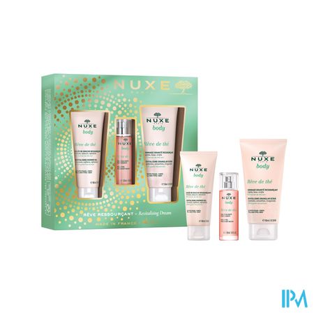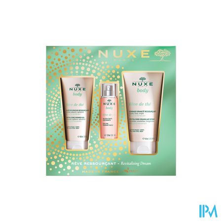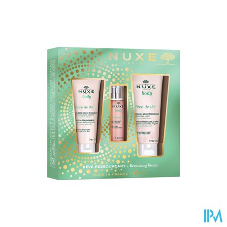 Geniet van een buitengewoon zintuiglijk moment met de lichaamsverzorging van de Set Lichaamsverzorging: / - NUXE Body Rêve de Thé Verfraaiend Geparfumeerd Water 30 ml / - NUXE Body Rêve de Thé Verkwikkende Douchegel 100 ml / - NUXE Body Rêve de Thé Verkwikkende Korrelige Scrub 150 ml / Producten ontwikkeld en gemaakt in Frankrijk. / Set gemaakt in Frankrijk, 100% karton, 0% plastic en recycleerbaar. / Verspreid golven van geluk met uw playlist by Nuxe : https://open.spotify.com/playlist/2CNPL7lPKl9Jk24EjgVuMB?si=7752f1429f554f94