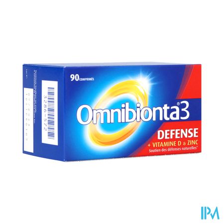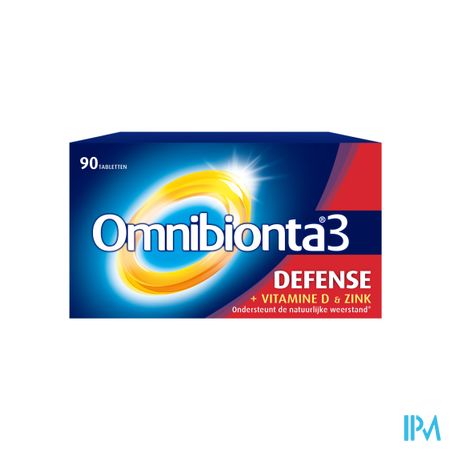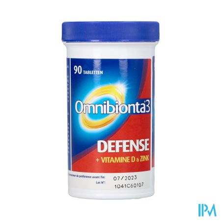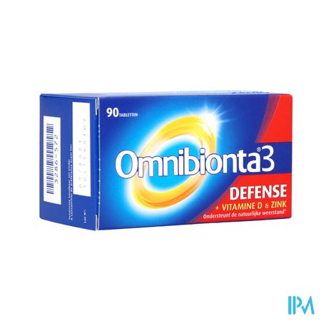Omnibionta3 Defense Multivitamines Immuniteit (90 tabletten) is een voedingssupplement, verkrijgbaar in uw buurtapotheek of online apotheek. Neem niet meer dan de aanbevolen dagelijkse dosis vermeld op de verpakking. Het vervangt geen gezonde levensstijl en gevarieerde en evenwichtige voeding. Vraag raad aan uw apotheker. Het product altijd buiten het bereik van kinderen houden.