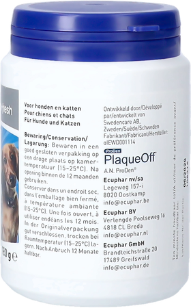 Orozyme Bucco Fresh PlaqueOff is een innovatie op het gebied van de verbetering van slechte adem en verbetering van de conditie van tandvlees en het gebit bij honden en katten. Orozyme Bucco Fresh PlaqueOff helpt het kleven van de tandplak voorkomen en weekt de aanslag los. Na enkele weken behandeling kunt u verbetering merken in conditie van de mond- en tandhygiëne van uw hond of kat.