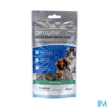 Orozyme Bucco-Fresh Dental Croqs zijn snacks die helpen een slechte adem bij honden en katten tegen gaan. Deze brokjes zijn arm aan calorieën waarmee u uw kat of hond meermaals per dag mee kan belonen.