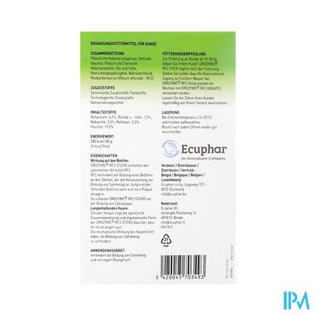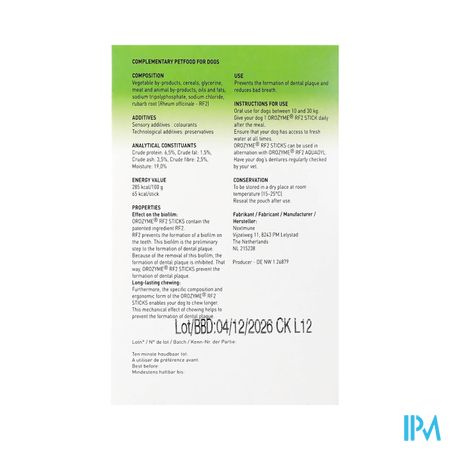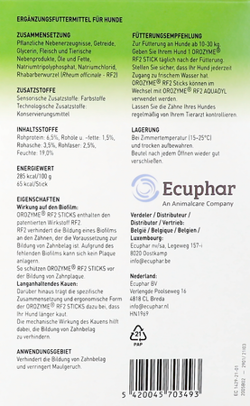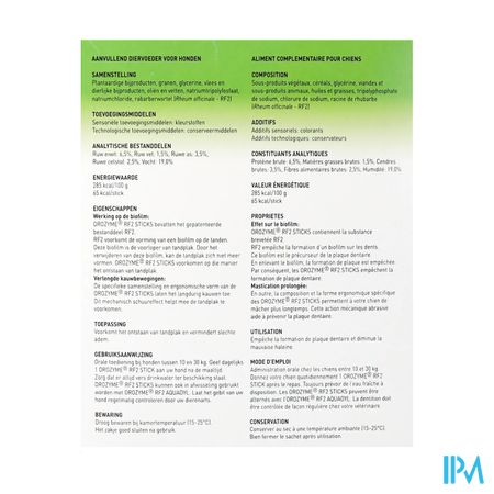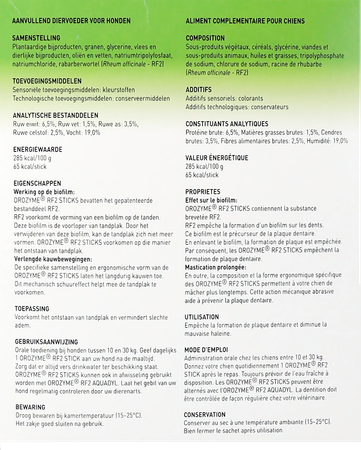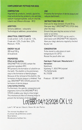 De samenstelling, de structuur en de vorm van de Orozyme RF2 Sticks zorgen voor een mechanisch schuureffect zodat de tanden tot op de tandvleeslijn gereinigd worden. De sticks bevatten een aanvaardbare hoeveelheid calorieën: Small 35 kcal, Medium 63 kcal en Large 90 kcal.