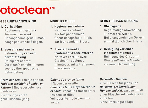 Bij rassen die op grond van de anatomie van hun uitwendig oor gevoelig zijn voor oorontsteking (cockerspaniël, setter, poedel enz. …), is het aanbevolen OTOCLEAN regelmatig te gebruiken, namelijk 1 à 2 maal per week.