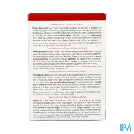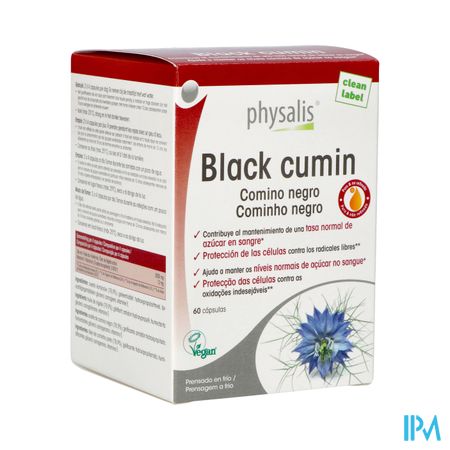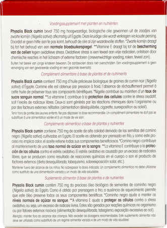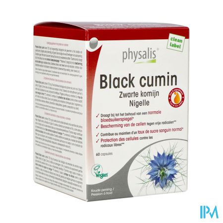 Physalis Black cumin bevat 750 mg hoogwaardige, biologische olie gewonnen uit de zaadjes van zwarte komijn (Nigella sativa) afkomstig uit Egypte. Deze kruidige olie wordt verkregen via koude persing. Doordat er geen hitte aan te pas komt, behoudt de olie al zijn waardevolle stoffen. *Zwarte komijn draagt bij tot het behoud van een normale bloedsuikerspiegel. **Vitamine E draagt bij tot de bescherming van de cellen tegen oxidatieve stress. Oxidatieve stress is een teveel aan vrije radicalen, ontstaan door chemische reacties in het lichaam of externe factoren (onevenwichtige voeding, roken, teveel zon).
