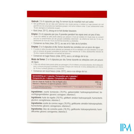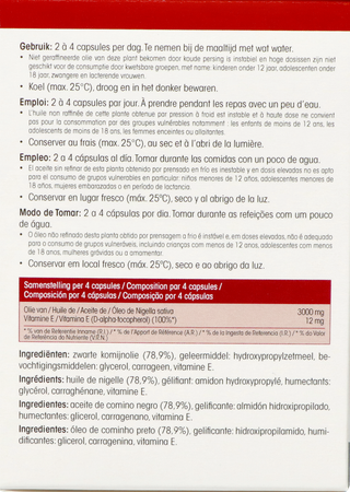 Ingrediënten: zwarte komijnolie (78,9%), geleermiddel: hydroxypropylzetmeel, bevochtigingsmiddelen: glycerol, carrageen, vitamine E.