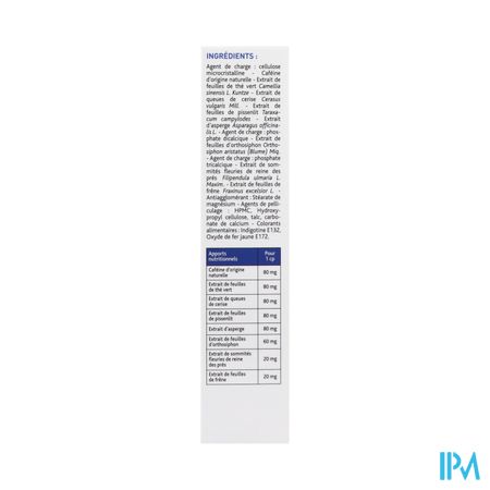 Vulstof: microkristallijne cellulose - Cafeïne van natuurlijke oorsprong - Extract van groene theebladeren Camellia sinensis L. Kuntze - Kersensteelextract Cerasus vulgaris Mill. - Extract van paardenbloemblad Taraxacum campylodes - Asperge-extract Asparagus officinalis L. - Vulstof: dicalciumfosfaat - Orthosiphon aristatus (Blume) bladextract Miq. - Bindmiddel: tricalciumfosfaat - Extract van bloeiende toppen van moerasspirea Filipendula ulmaria L. Maxim. - Extract van essenblad Fraxinus excelsior L. - Antiklontermiddel : Antiklontermiddel: magnesiumstearaat - Filmomhullingsmiddelen: HPMC, Hydroxypropylcellulose, talk, calciumcarbonaat - Voedingskleurstoffen: indigotine E132, geel ijzeroxide E172.