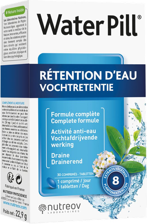 Voel je je opgeblazen? Dit komt zeker door het vasthouden van water. Dit is een ophoping van water in de weefsels van het lichaam: het lichaam, dat van nature ongeveer 60% water bevat, is niet in staat het overtollige water af te voeren. Er ontstaan dan zwellingen in de voeten, enkels, benen of vingers. WaterPill® Water Retention is het resultaat van onderzoek van Nutreov laboratoria en is geïnspireerd door de natuur. Het combineert 8 plantenextracten (cafeïne, paardenbloem, kers, orthosifon, groene thee, es, moerasspirea en asperge) om u te helpen overtollig water af te voeren.