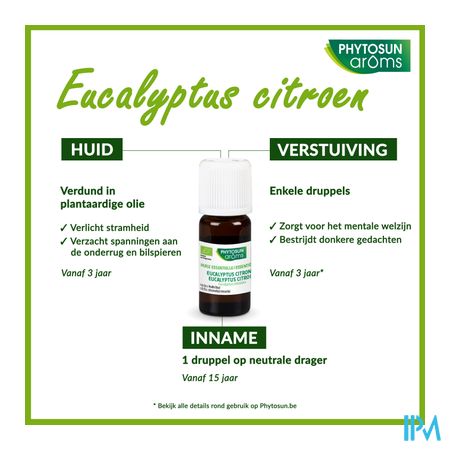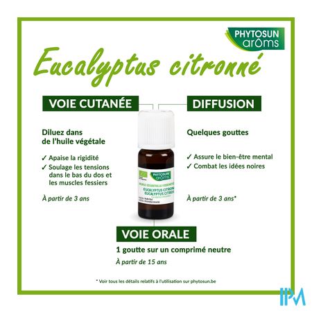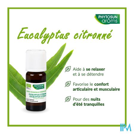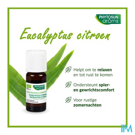 Phytosun Eucalyptus citroen BIO 10 MLHelpt o.a.: •Te relaxeren en tot rust te komen•Spier- en gewrichtscomfort te verbeteren