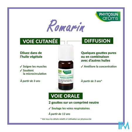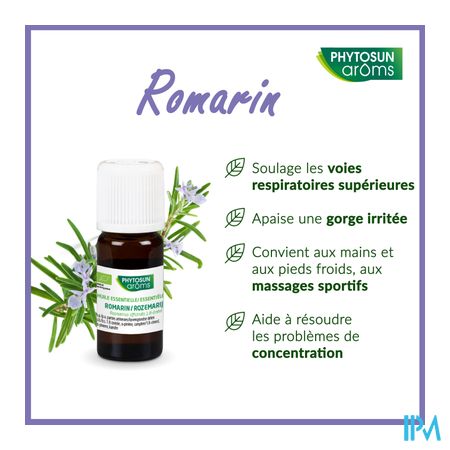 Phytosun Rozemarijn BIO 10 MLHelpt o.a.: •Problemen met de bovenste en onderste luchtwegen te verlichten•Een geïrriteerde keel te verzachten•Bij koude handen en voeten•Bij sportmassages•Bij concentratieproblemen