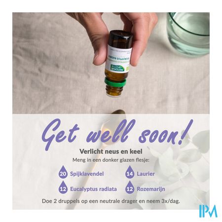 Verlicht neus en keel: meng 20 druppels Spijklavendel, 14 druppels Laurier, 12 druppels Eucalyptus Radiata en 12 druppels Rozemarijn in een donkergekleurd glazen flesje. Neem 2 druppels van dit mengsel in op een neutrale tablet en herhaal dit 3 x per dag, gedurende 7 dagen max.
