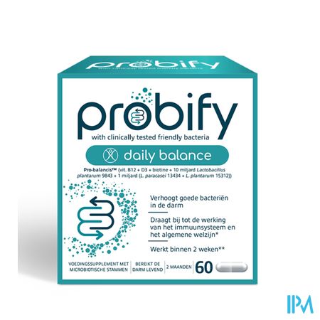 Probify Daily Balance Caps 60 is een voedingssupplement, verkrijgbaar in uw buurtapotheek of online apotheek. Neem niet meer dan de aanbevolen dagelijkse dosis vermeld op de verpakking. Het vervangt geen gezonde levensstijl en gevarieerde en evenwichtige voeding. Vraag raad aan uw apotheker. Het product altijd buiten het bereik van kinderen houden.