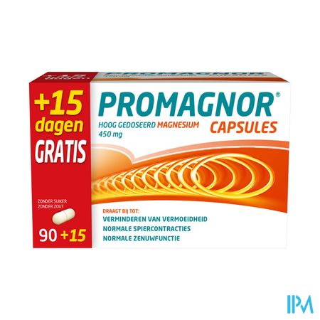 Promagnor: Hoog Gedoseerd Magnesium 450mg (90+15 capsules) is een voedingssupplement, verkrijgbaar in uw buurtapotheek of online apotheek. Neem niet meer dan de aanbevolen dagelijkse dosis vermeld op de verpakking. Het vervangt geen gezonde levensstijl en gevarieerde en evenwichtige voeding. Vraag raad aan uw apotheker. Het product altijd buiten het bereik van kinderen houden.